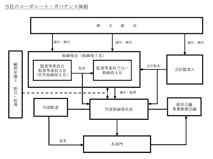 経営上の重要事項から実務上の諸問題に至る細かい事項まで、法律専門家の意見や会議への出席を求め、適切な経営判断や業務執行を行う体制ができております。取締役会は毎月1回開催し、経営方針、経営戦略についての意思決定機関として取締役(監査等委員であるものを除く。以下同じ)4名及び監査等委員である取締役3名の全員により構成されております。