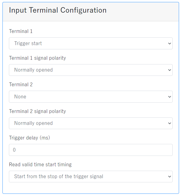 | Terminal 1 | Select the operation from "None" or "Trigger start" for the input terminal 1 function. |