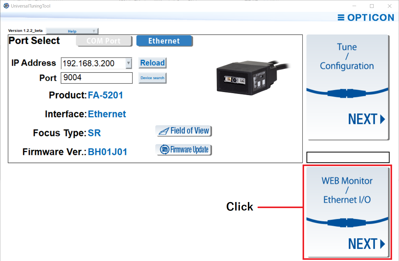 Click "Web Monitor / Ethernet I/O" in the UniversalTuningTool port select window.